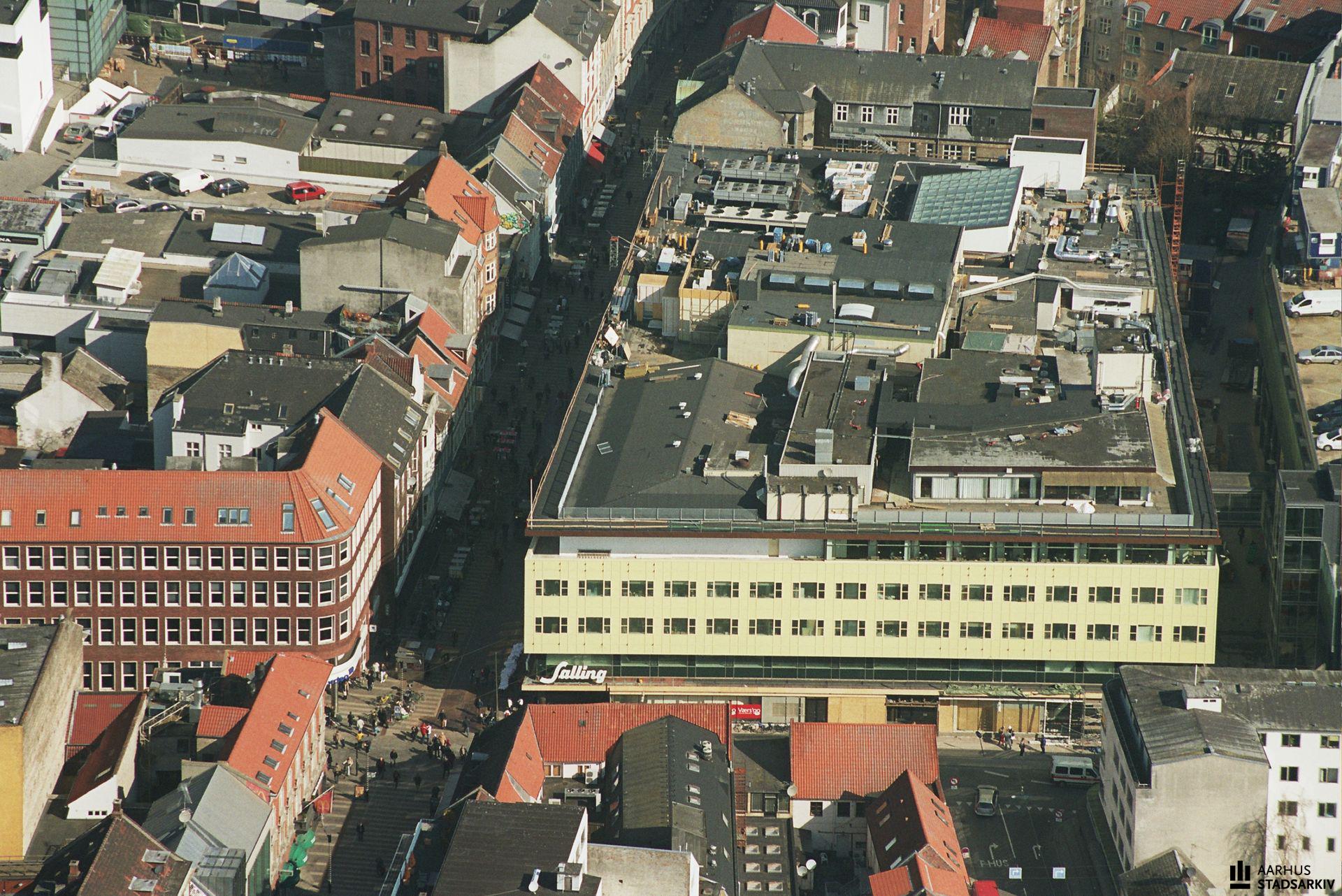 Luftfoto af Salling og omkringliggende bygninger efter ny tilbygning til stormagasinet.