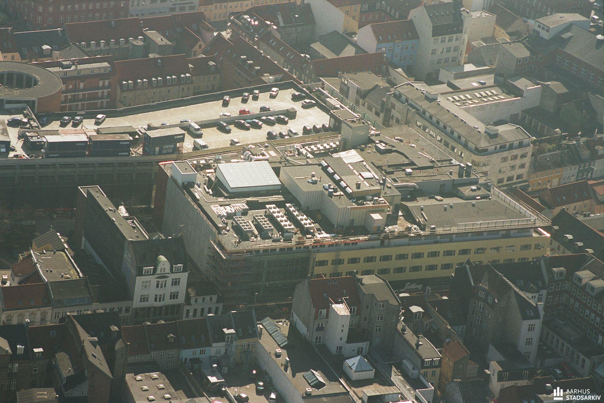 Luftfoto af Salling og omkringliggende bygninger efter ny tilbygning til stormagasinet.