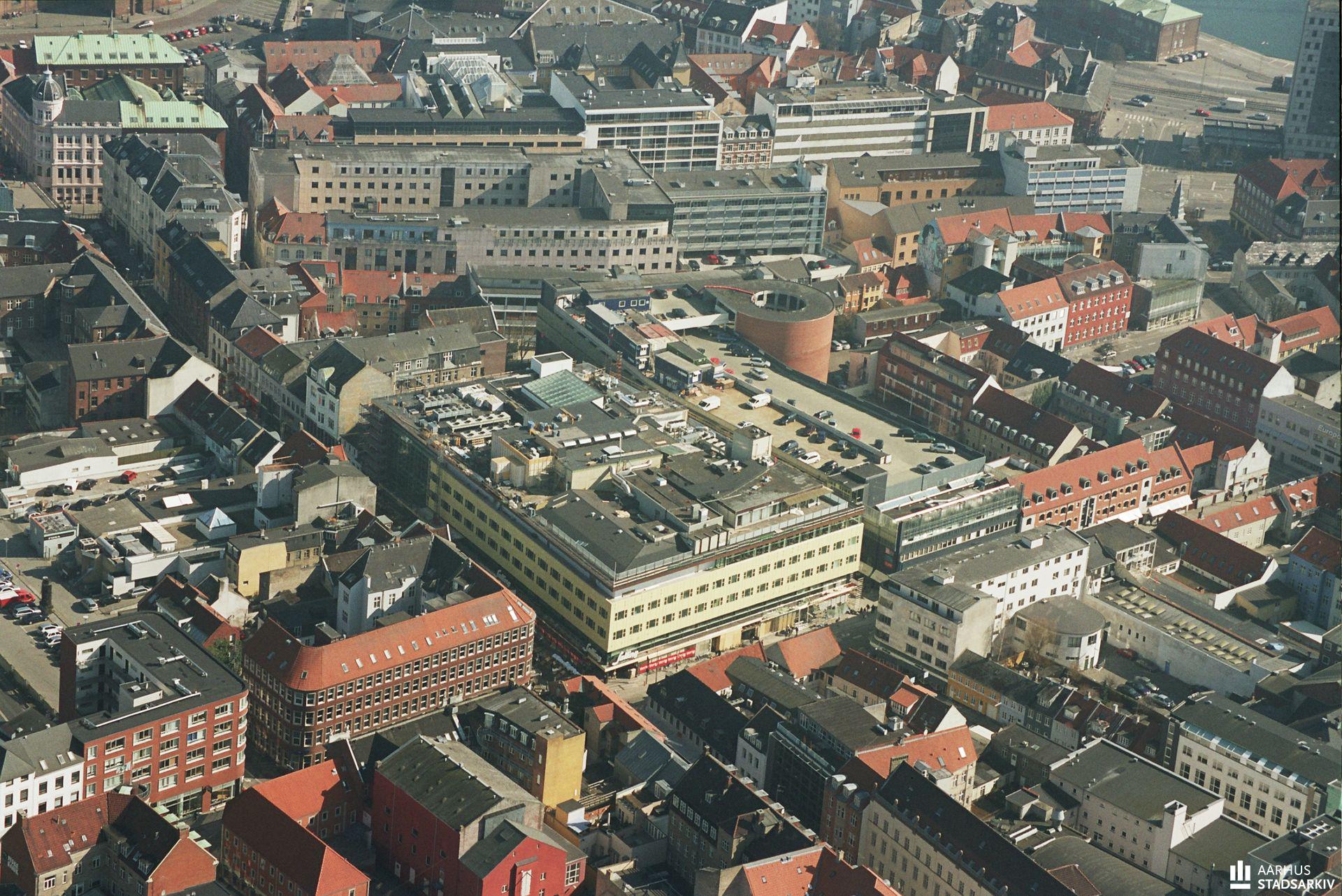 Luftfoto af Salling og omkringliggende bygninger efter ny tilbygning til stormagasinet.