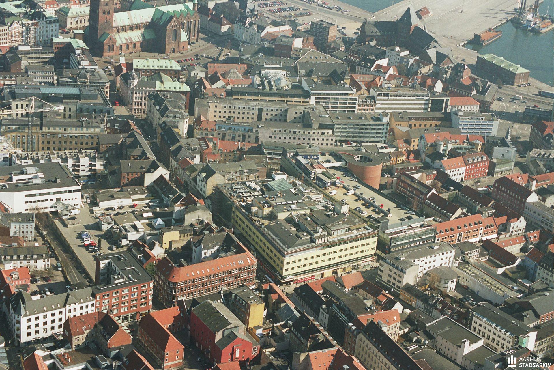 Luftfoto af Salling og omkringliggende bygninger efter ny tilbygning til stormagasinet.